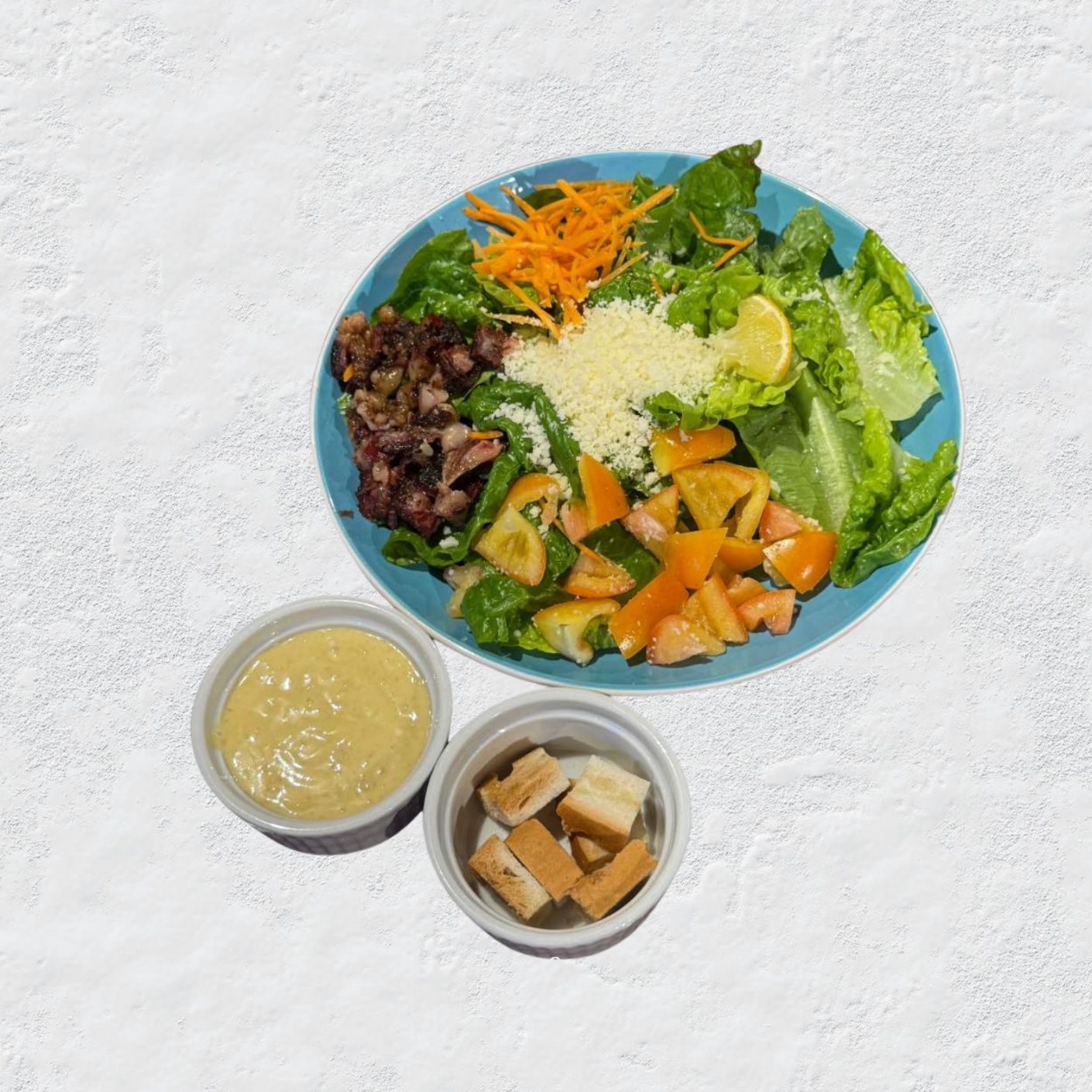 Fresh romaine lettuce, carrots, and tomatoes with smoked angus beef belly bits and parmesan, served with croutons and signature caesar dressing on the side for you to toss and enjoy.