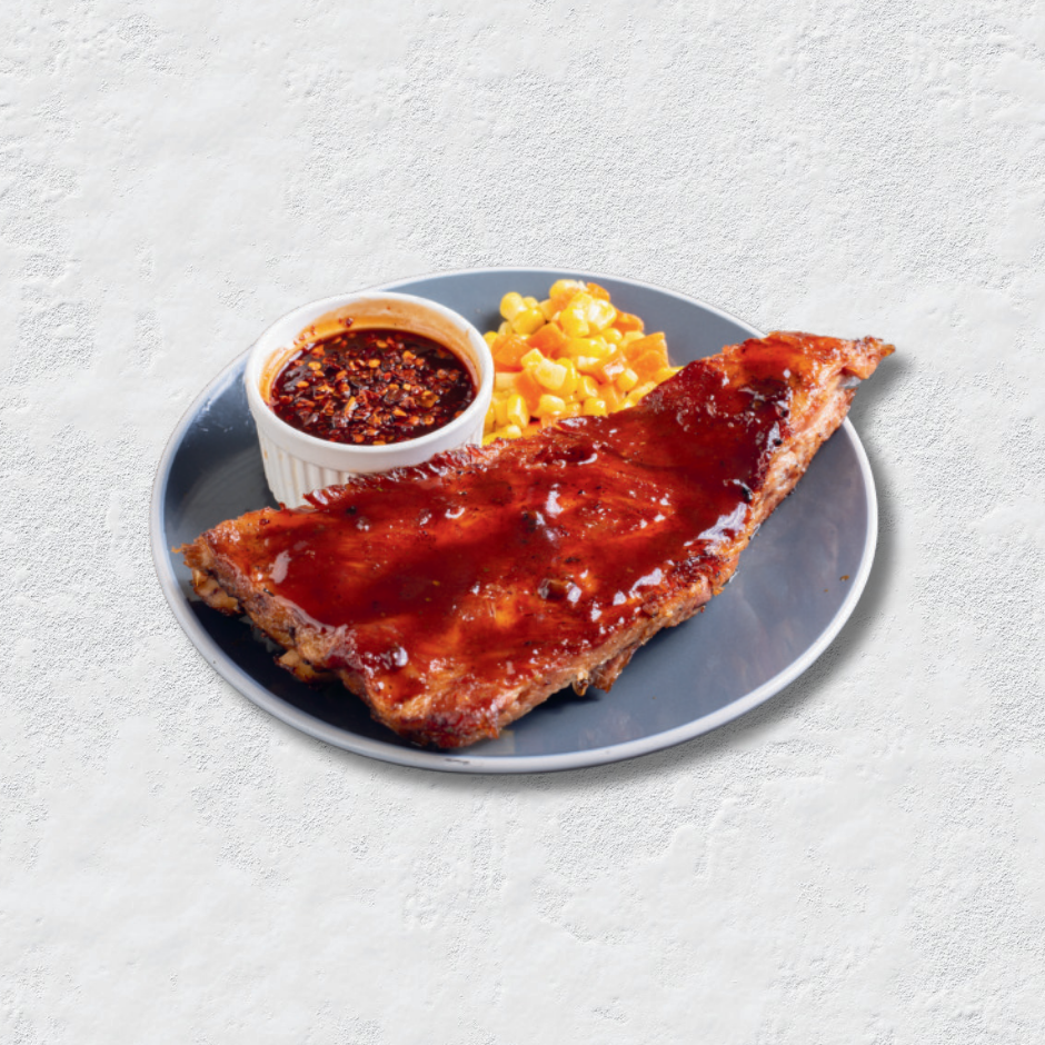 200 to 250g 6-8 hours smoked pork ribs served with corn & carrots.