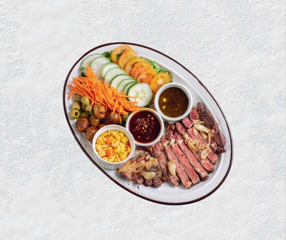 A 250g Grass-Fed Rib Eye Steak with vinaigrette salad, corn & carrots, and potato marbles